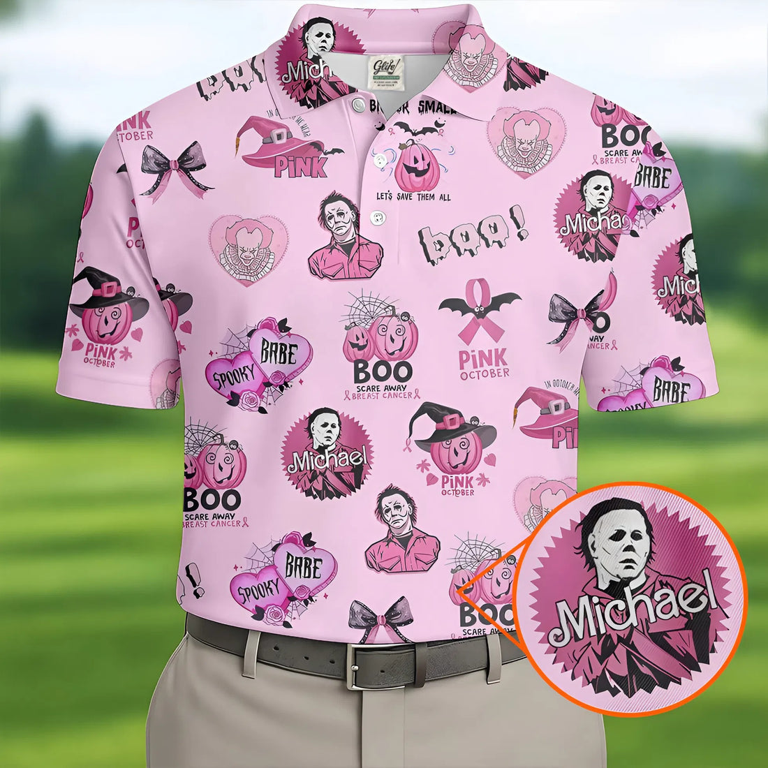 Funny Michael Horror Character Men's Golf Shirt, Pink October Shirt, Halloween Golf Shirt, Men's Golf Shirt