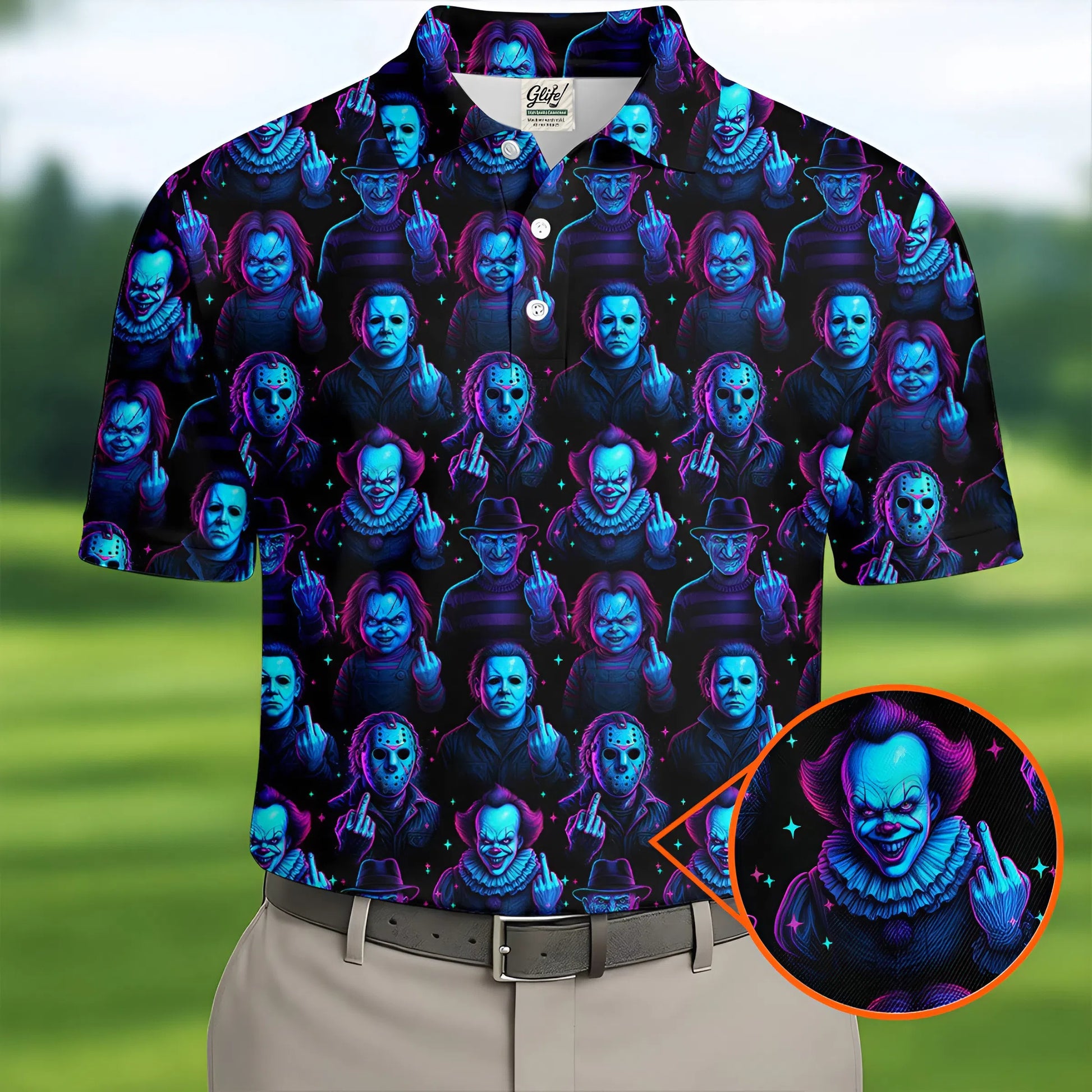 Funny Middle Finger Men's Golf Shirt, Horror Character Shirt, Halloween Golf Shirt, Scary Halloween Shirts